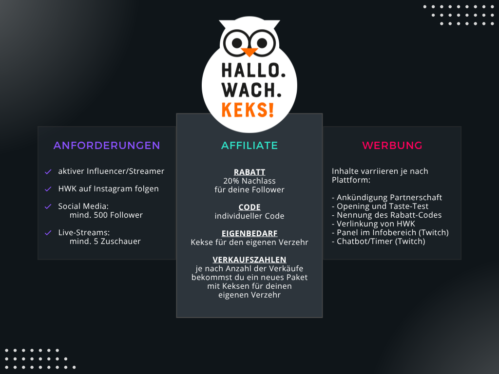 PURE4U übernimmt als Marketing-Agentur das Influenzer-Management für Hallo.Wach.Keks und wird die Bewerbungen prüfen, sowie die Partnerschaften verwalten. Diesen Werbe-Deal dürfen alle Creator (m/w/d) in Anspruch nehmen, auch wenn sie keine anderen Leistungen von PURE4U beziehen (Impressum, Creator, Talent).